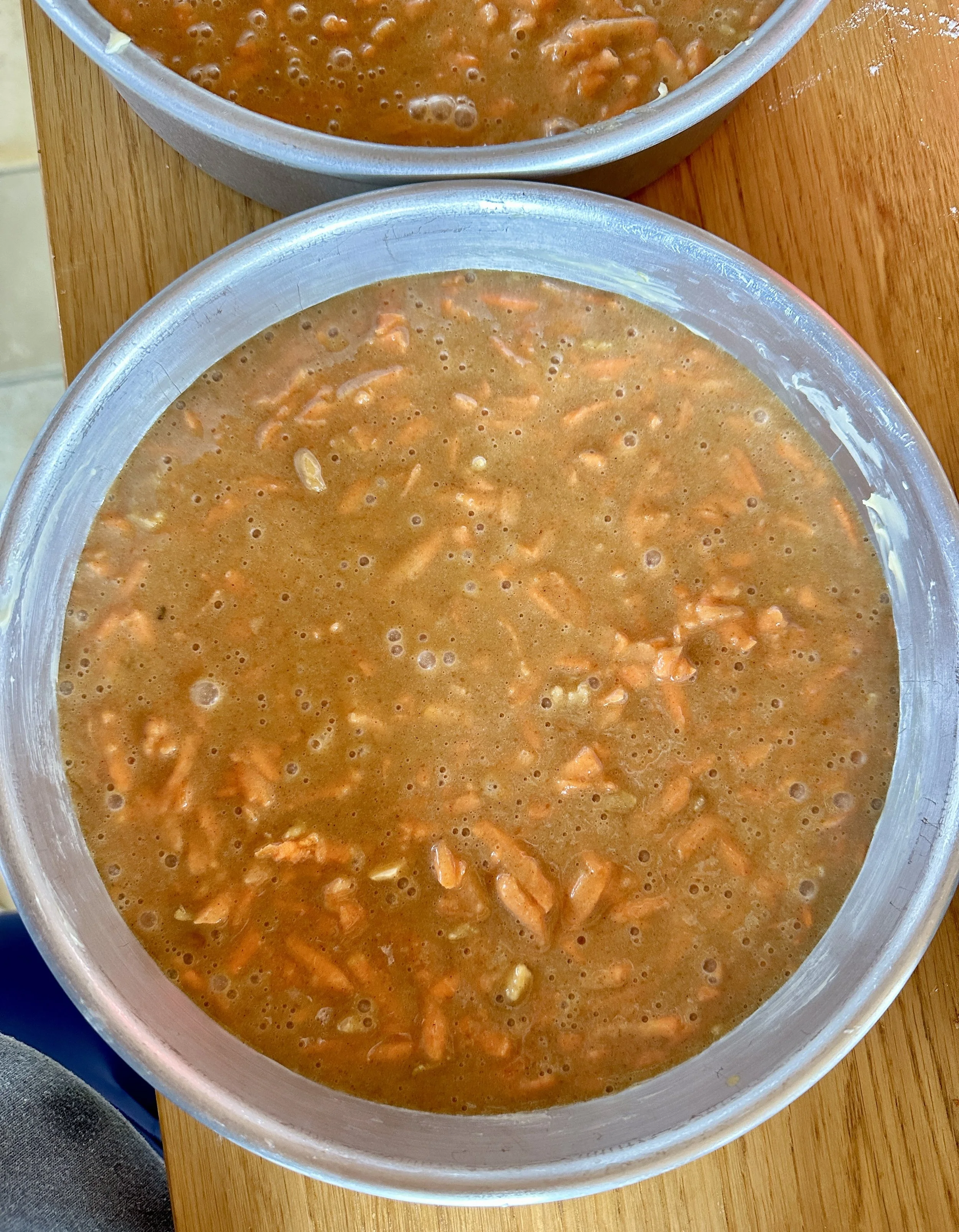 BAKE CAKE: Divide the cake batter between the prepared cake pans.