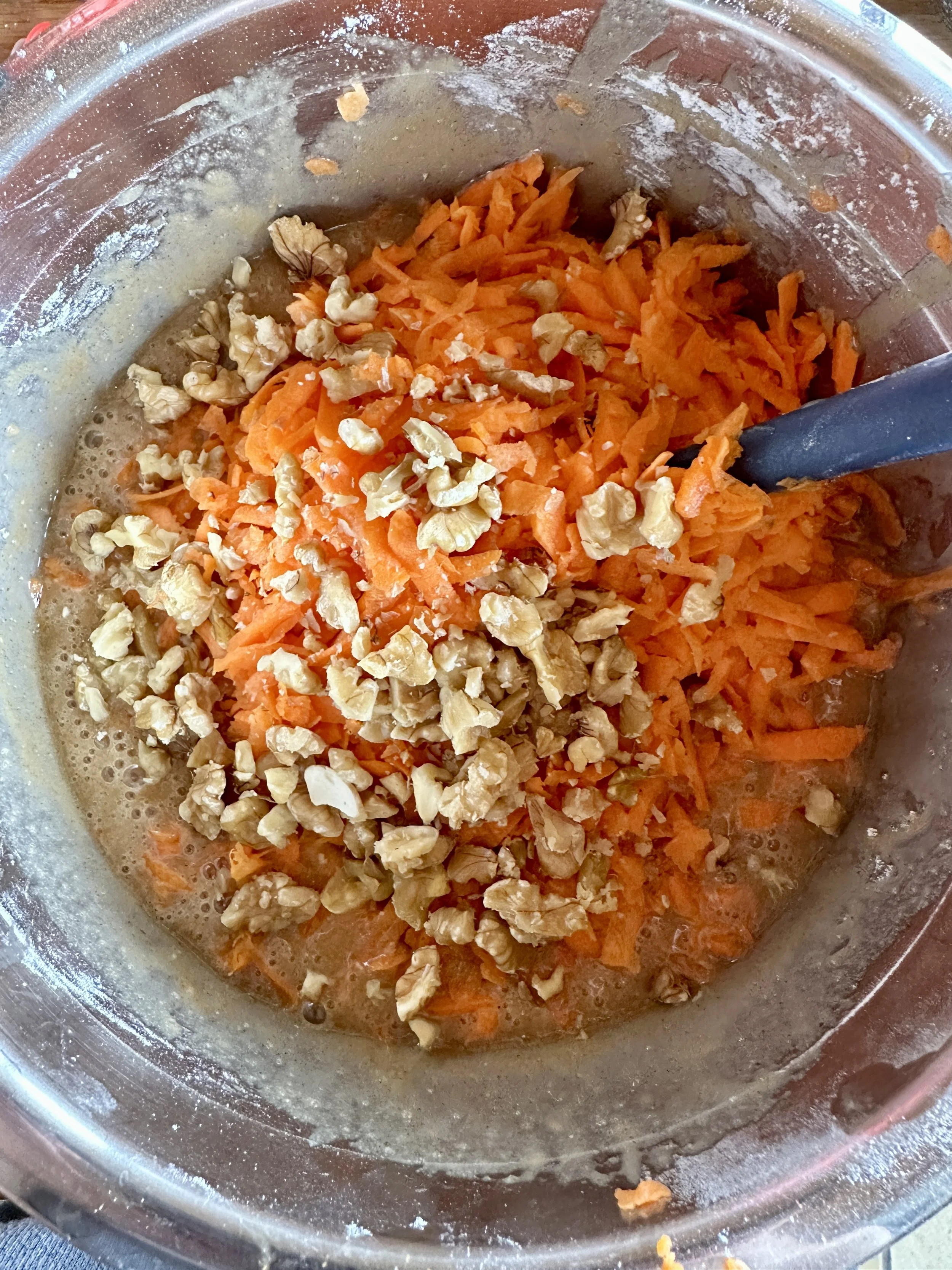 Stir in the carrots, nuts, and raisins.