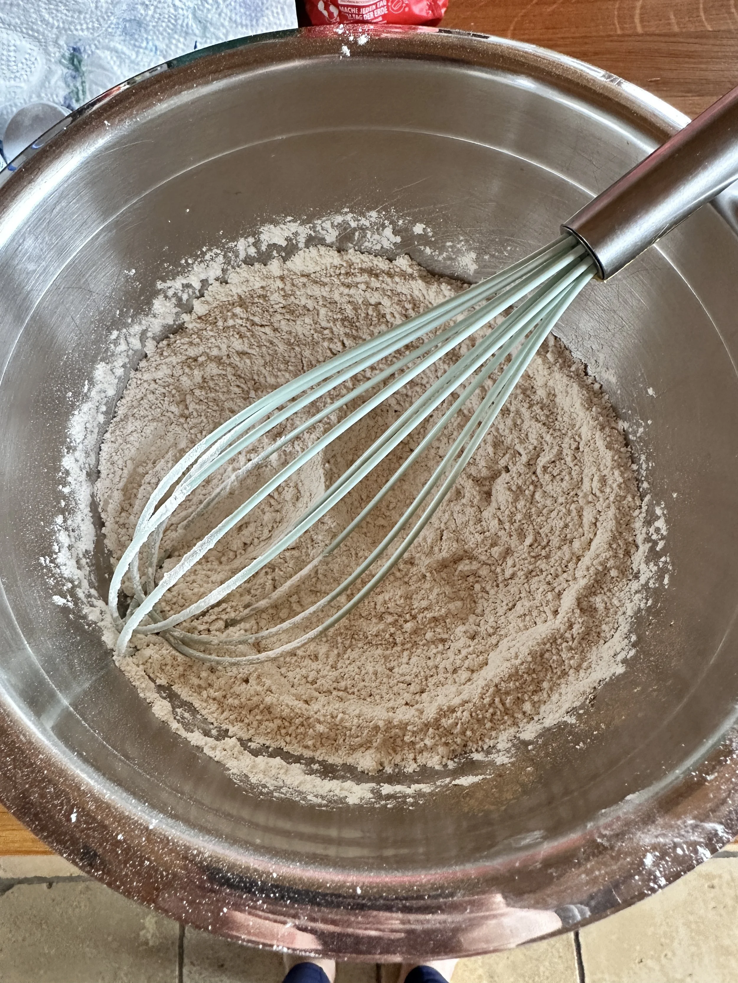 Switch to a large rubber spatula. Scrape the sides and bottom of the bowl, then add the dry ingredients in three parts, gently stirring until they disappear and the batter is smooth.