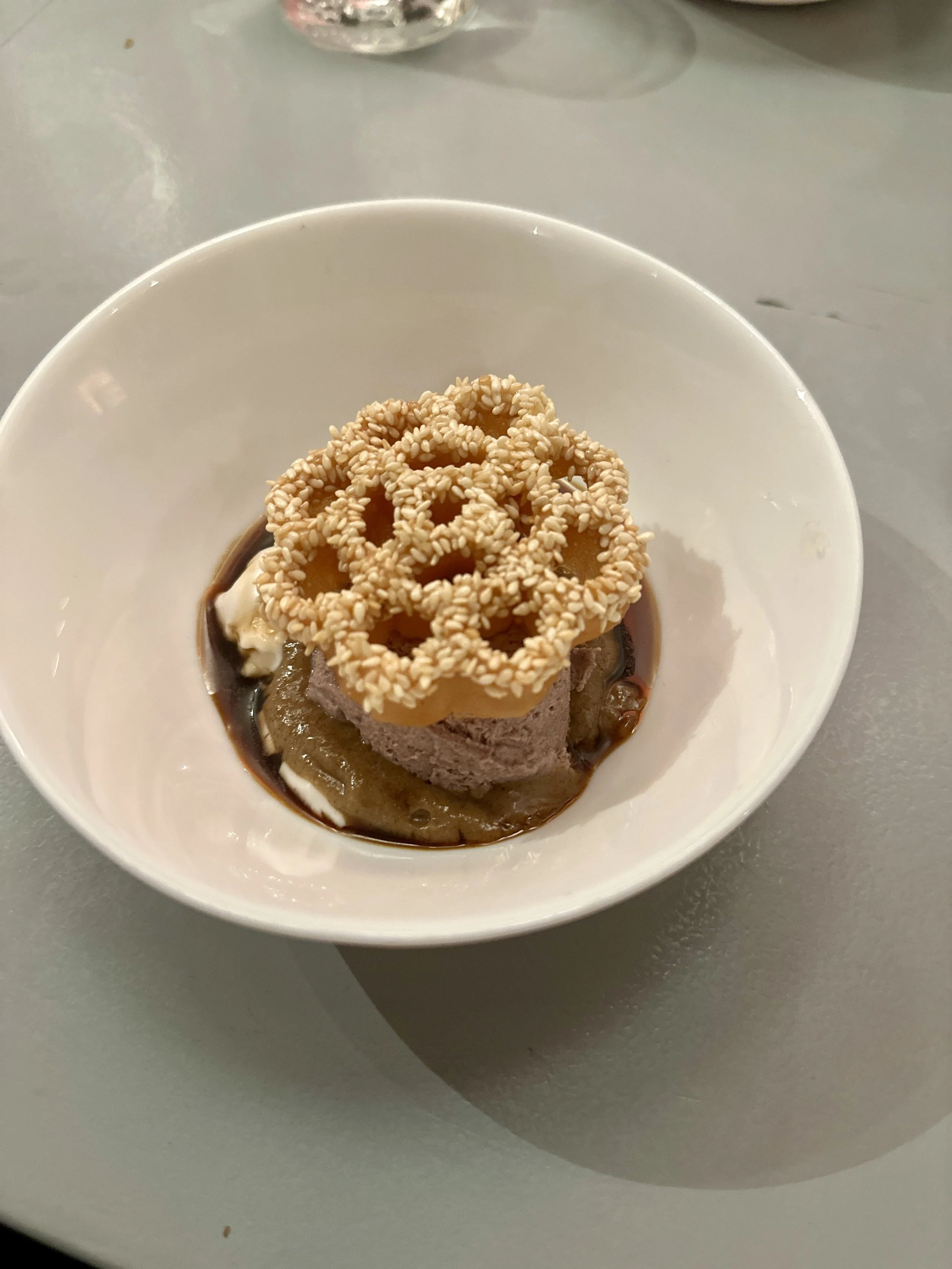 KEMBANG GOYANG- Black sticky rice cream, banana pudding, fermented rice and sesame cracker